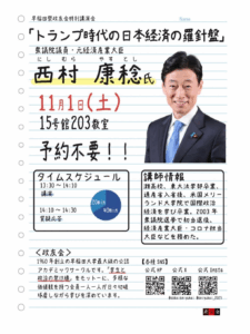 【早稲田祭特別講演会開催決定‼️】 早稲田大学公認サークル政友会では早稲田祭1日目の11月1日(土)に元経済産業大臣の西村康稔衆議院議員をお招きし、「トランプ時代の日本経済の羅針盤」をテーマに特別講演会を開催します!!! […]